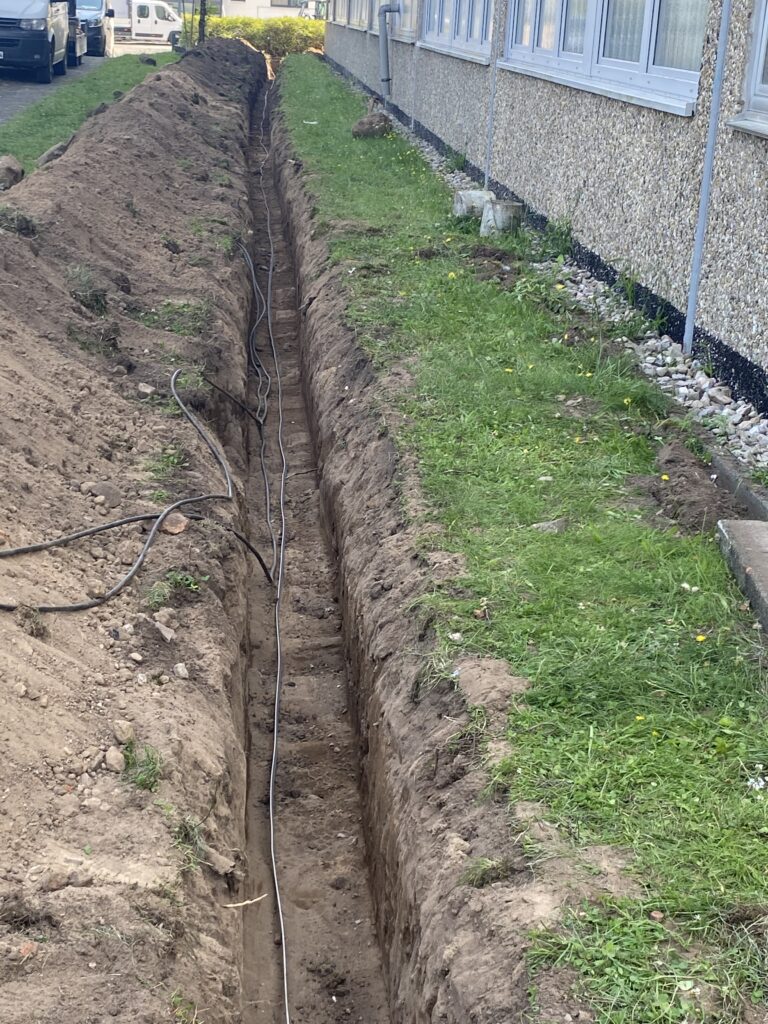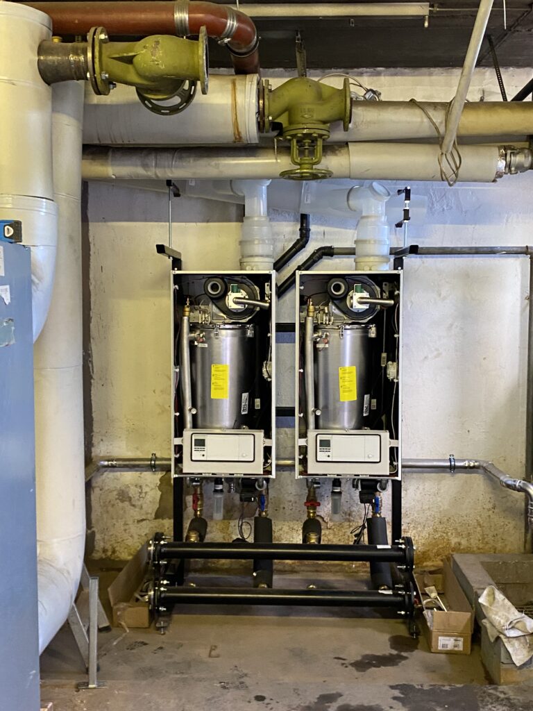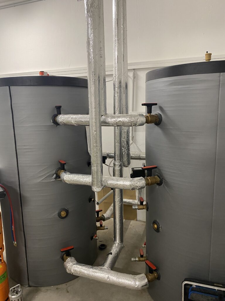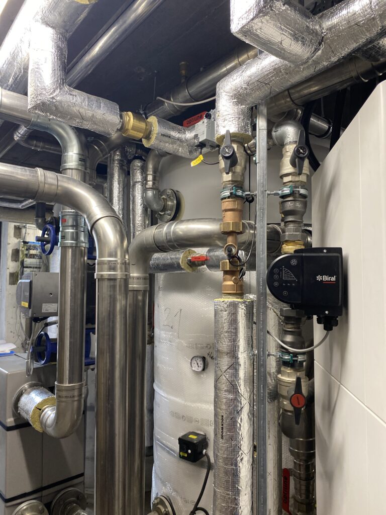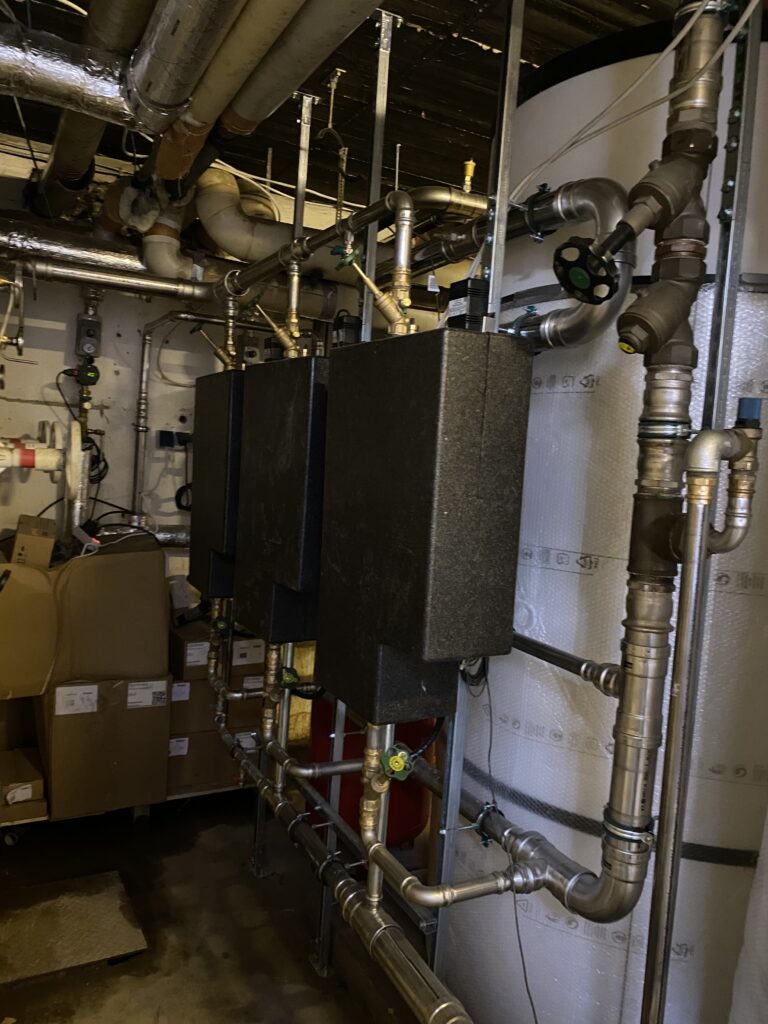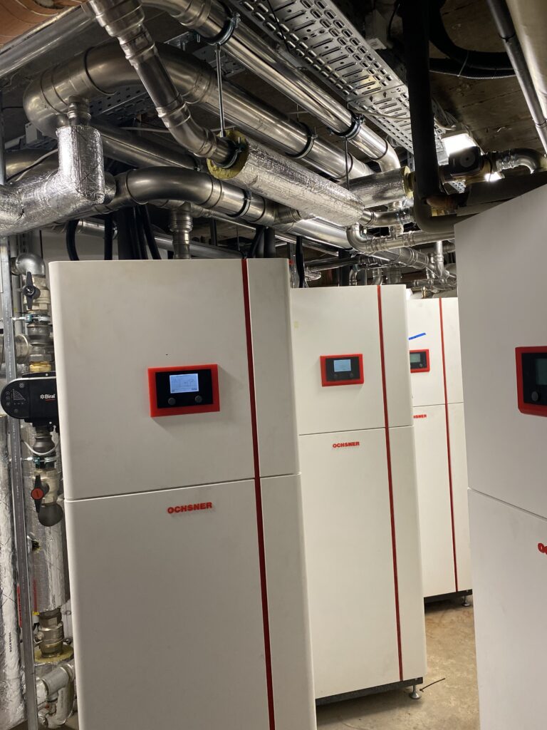 Die energetische Sanierung des MFH mit 14 Wohneinheiten hat vom August´24 bis Oktober´24 stattgefunden. Das Haus wurde ursprünglich mit einer Dampf betriebenen Fernwäemeanlage aus dem Jahr 1968 versorgt. Die Anlage lief mit über 80°C Vorlauftemperatur und hatte eine Heizleistung von 120 KW. Die Energiekosten waren zu diesem Zeitpunkt in „astonomischen Höhen“ gestiegen. Nach der Planung und Neuauslegung wurde berechnet das max. 75 KW Heizleistung für dieses Objekt völlig ausreichend sind. Als Hauptenergieträger wurden zwei Ochsner Wärmepumpen „Air Hawk 1850“ mit jeweils 40 KW Heizleistung geplant und verbaut. Als zusätzliche Spitzenlastabsicherung sind nochmals zwei Heizstäbe mit einer Gesamtleistung von 24 KW integriert worden.